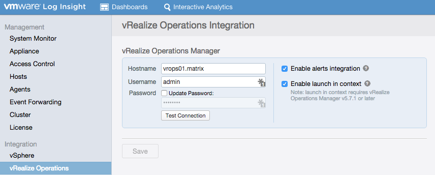 - If multiple LI instances are integrated with the same vR Ops instance then some integration benefits will only be available to the last configured LI instance — more on this in a future post.