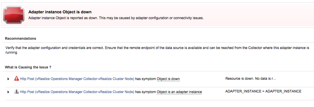 While I was on the Alerts page of vR Ops waiting for an alert sent from LI, I received an alert that an adapter instance object was down: