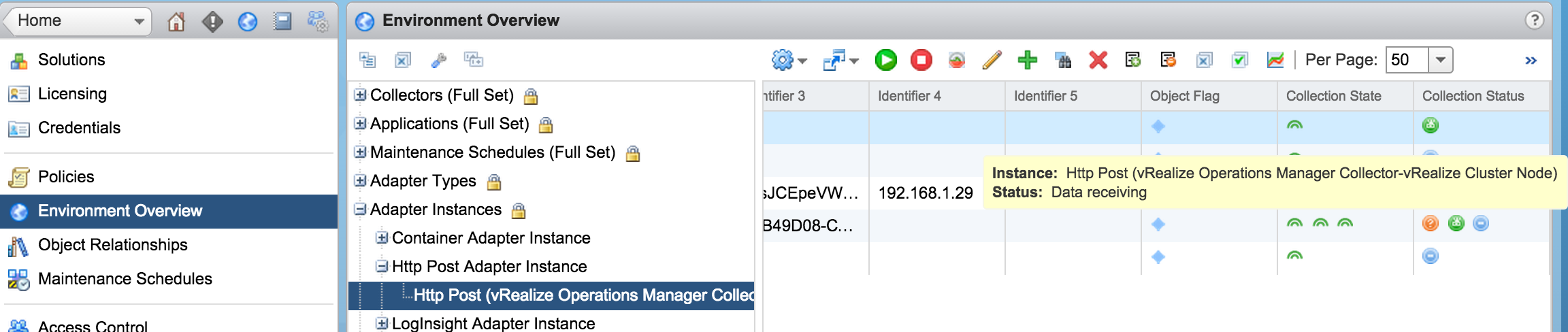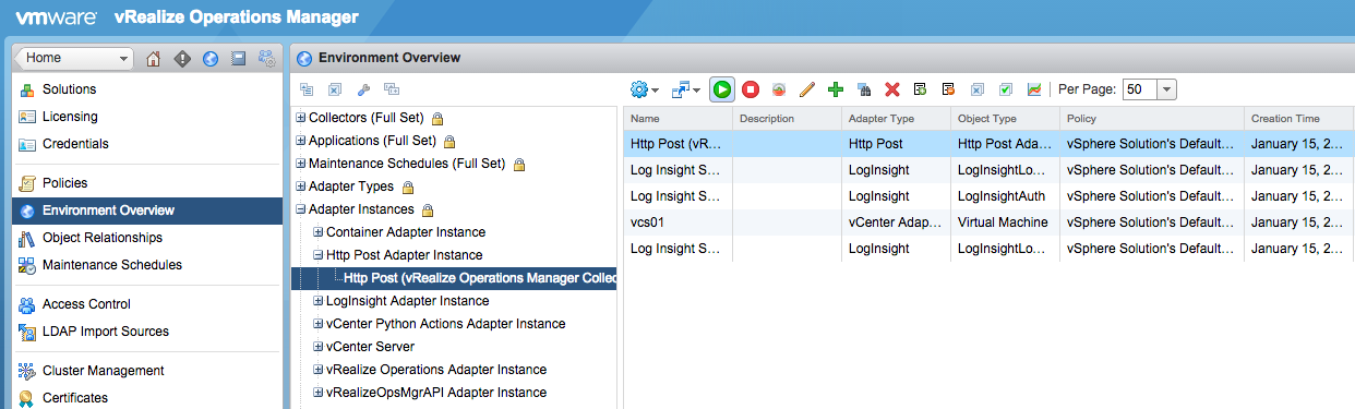 I asked around and my colleague Ryan Cartwright pointed me to the Environment Overview section of the Administration UI. In there are a variety of sections including Adapter Instances. Upon expanding this section, an HTTP Post Adapter Instance section exists and within this section is HTTP Post. Selecting HTTP Post brings up a list of adapters. Given that I knew the HTTP Post adapter was the one reporting and issue, I selected it and then selected the green play button above it, which when you hover over it says, “Start Collecting.”: