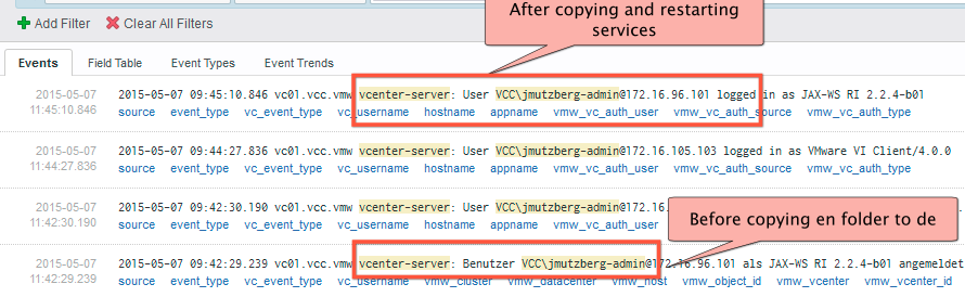 A-ha! This query requires English keywords (“logged in”) in order to match events, but our events are in German. This confirms that events must be ingested in English especially if you wish to leverage existing content packs today. Now, you could make a content pack for German events, but that is outside the scope of this post. Instead, let me cover how you would change the locale of vCenter Server so events are received in English.