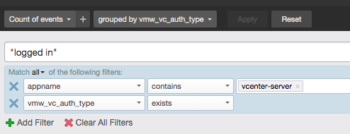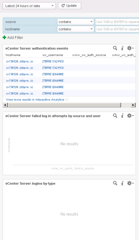 Wait, why do we have no results? We just saw that events were being received. Let’s view one of these dashboard queries on Interactive Analytics. We will look at vCenter Server logins by type: