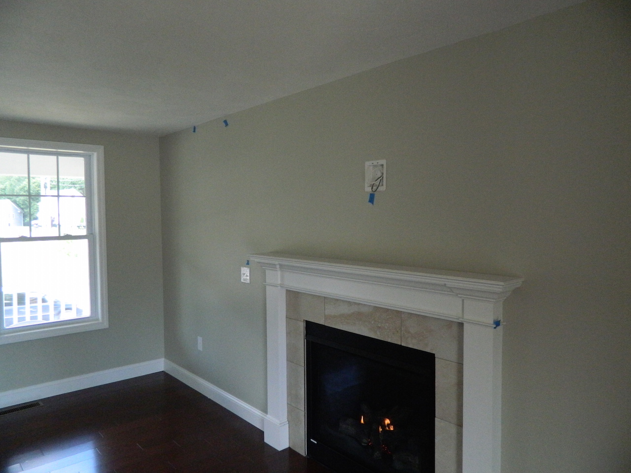 My new living room features a fireplace with hookups for a TV above it. Knowing that studs are typically 16 inches apart, I figured the stud was to the right of the outlet so the mount would be center to the fireplace.