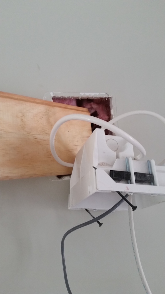 After getting the lumber behind the wall, I changed the direction of the board from horizontal to vertical. I also ensured the board was centered against the outlet hole (note the insulation was kind enough to hold the board against the drywall):
