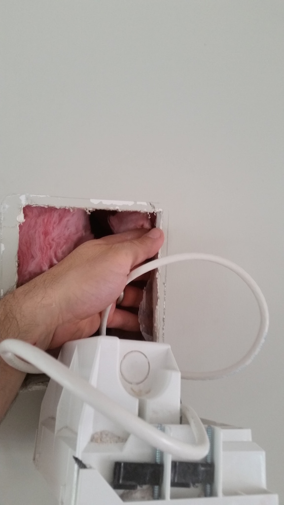 Next up, I unscrewed the outlet and carefully pulled it out. Then I slipped the cut lumber into the outlet hole pushing the insulation back so the lumber could sit against the drywall.