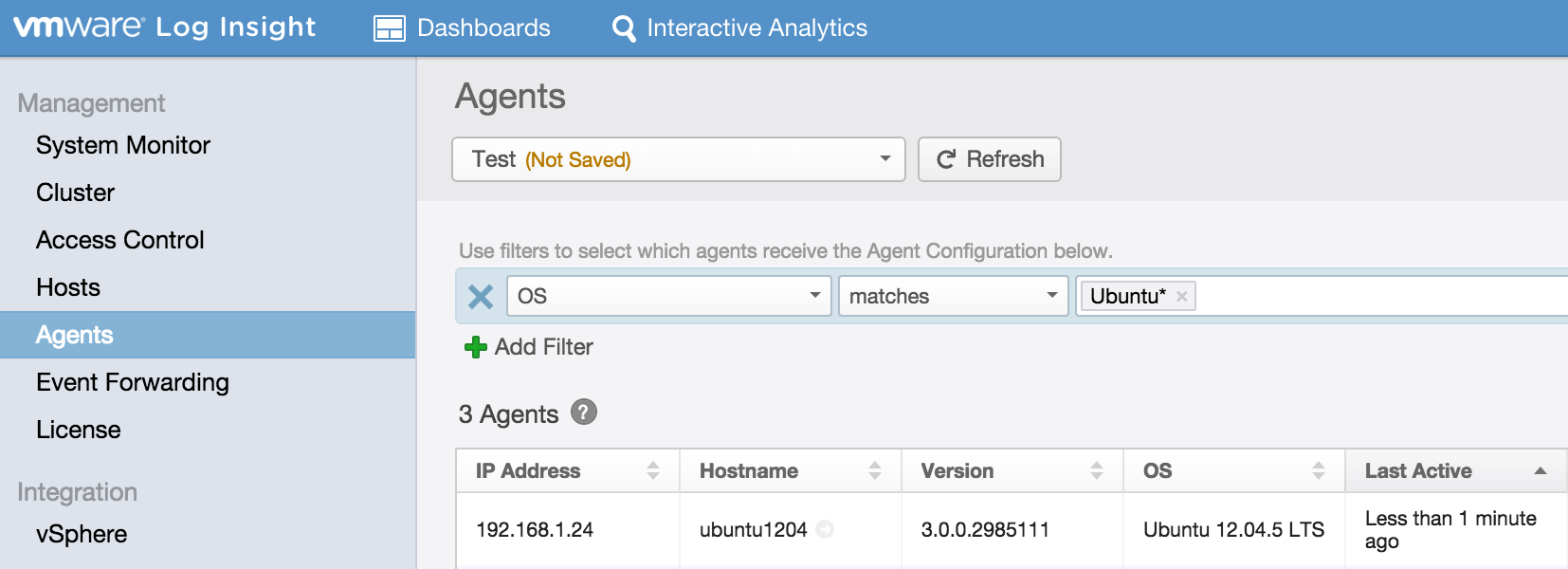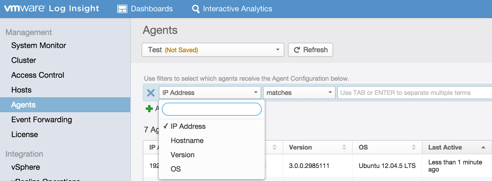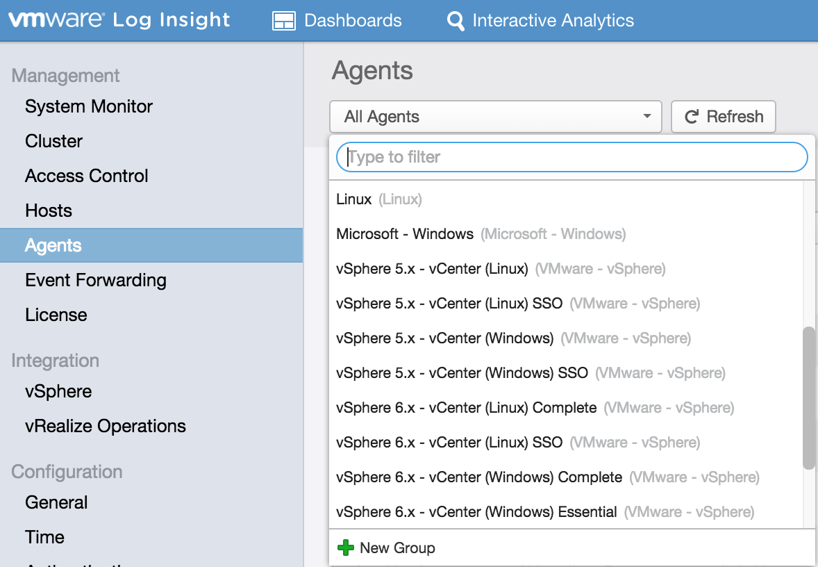 The Log Insight administrative UI has an Agents section. This section provides a list of all agents that have reported since the last server restart as well as a configuration box which can be used to configure agents server-side. In Log Insight 2.5, this configuration box was an all or nothing operation meaning the configuration either went to all connected agents or if no configuration was specified then to no agents.