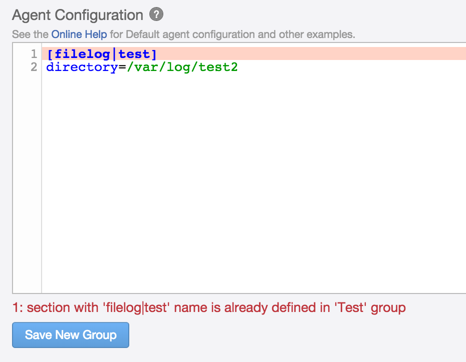 - Since an agent can belong to one or more groups, section names must be unique per Log Insight instance to prevent conflicts. If you attempt to reuse a configuration name you will receive an error: