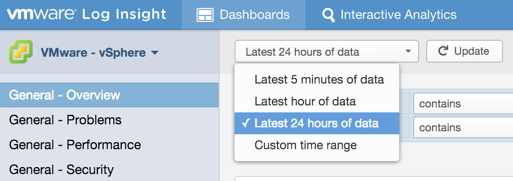 Content packs require data in a specific format to work properly. Content packs contain directions — either within Log Insight or from VMware Solution Exchange — which describe the steps and format in which data must be ingested. If you believe you have configured everything correctly and you are still not receiving results it may be because of the time range or because no results have actually been received for the defined widget. If you do experience an issue or have a question about a content pack, be sure to post it on the Log Insight Community.