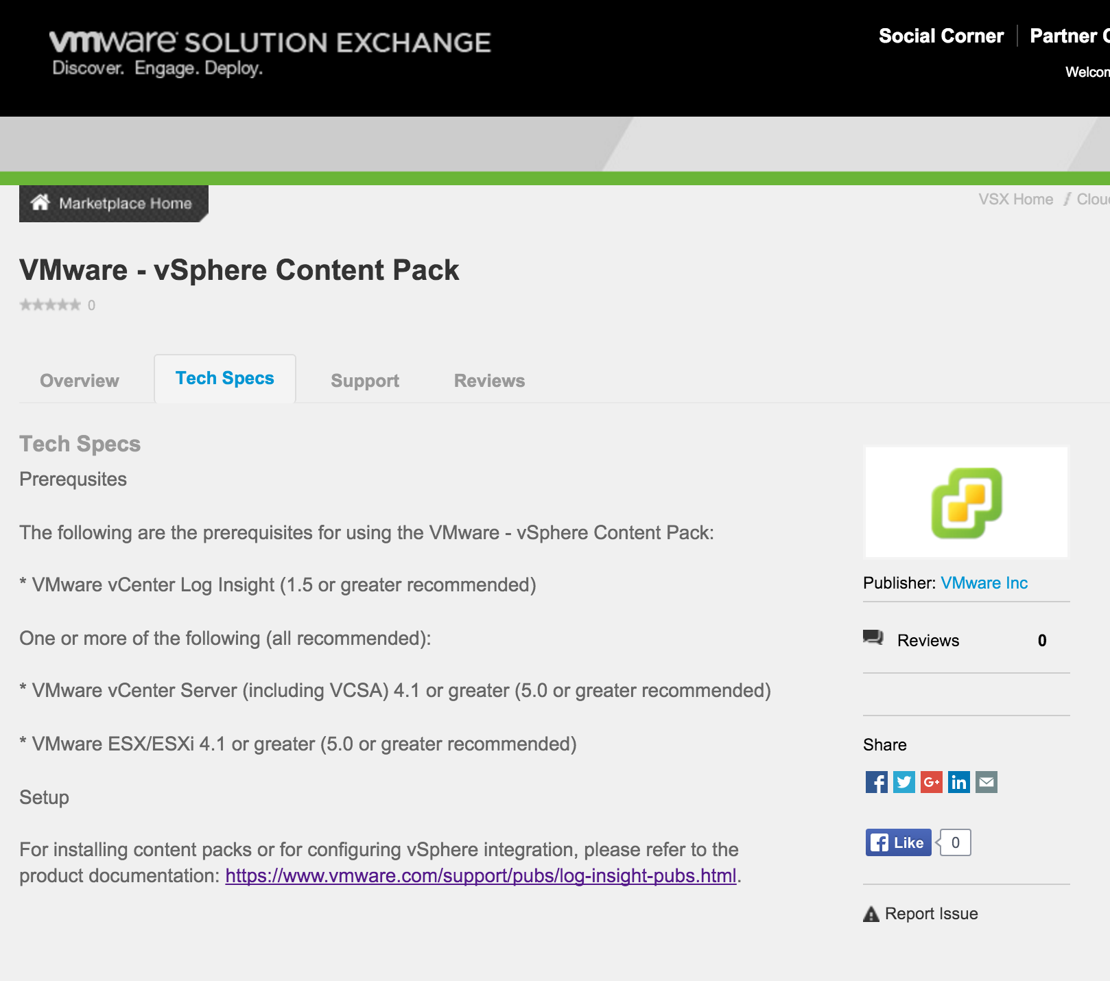 - Tech Specs: Here you will find what version(s) of Log Insight and what version(s) of the product the content pack supports are required for the content pack to work.