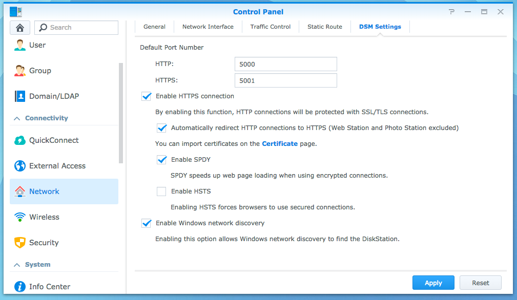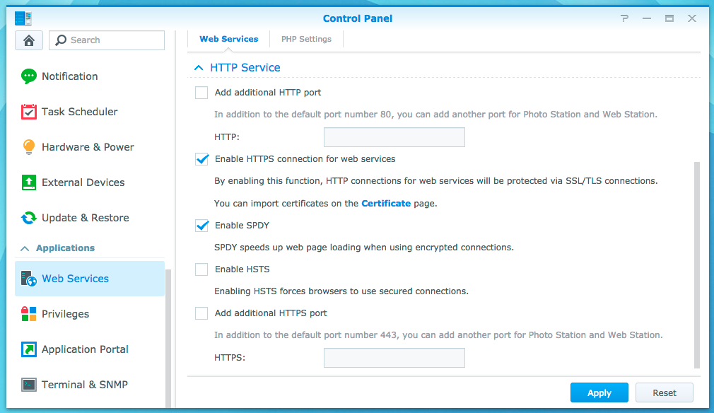Another place in which HTTPS can be enabled is under Web Services. If you are or plan to either host a website or enable Cloud Station you will need Web Services. Both websites and Cloud Station support HTTPS connections, but such functionality needs to be enabled under Web Services.