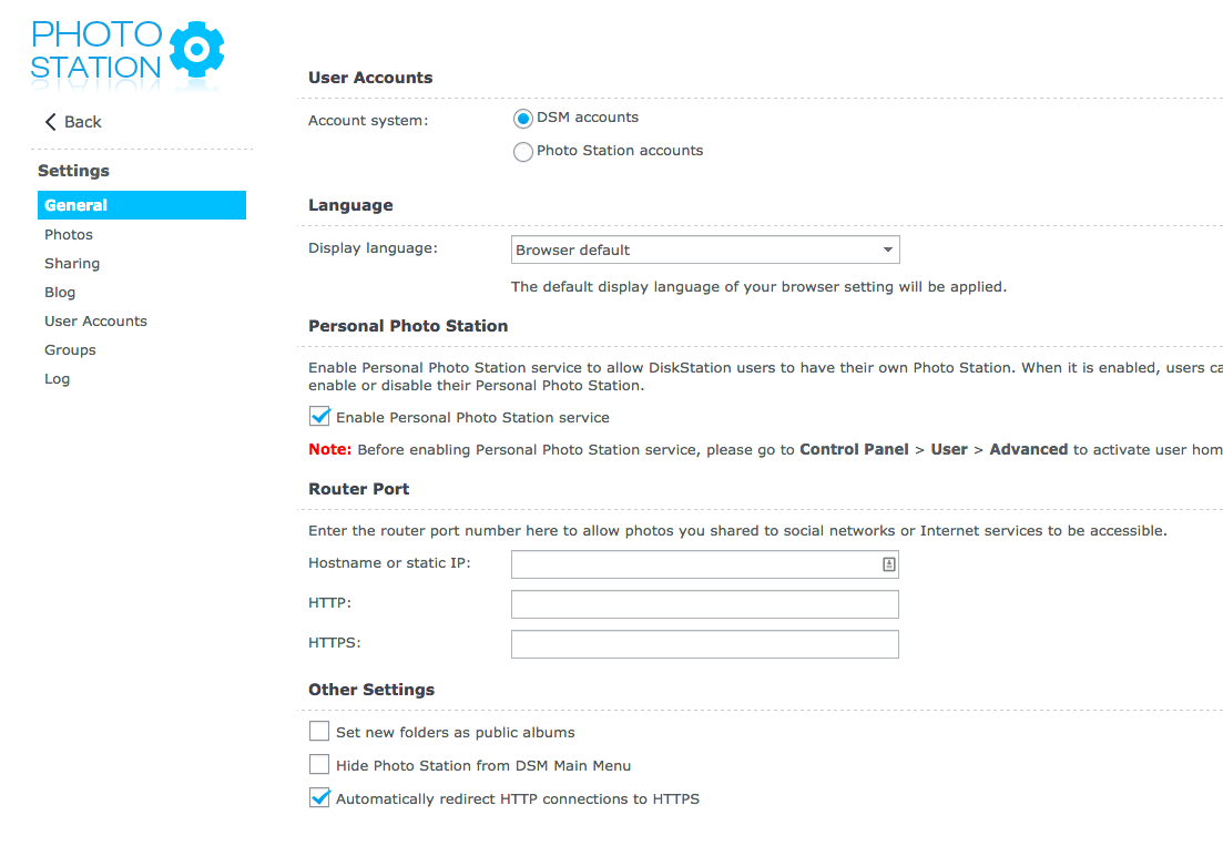 As mentioned earlier, enabling HTTPS under DSM Settings does not work for Web or Photo station. These two applications require enabling HTTPS directly within them. For example, on Photo Station you to select the checkbox under the Other Settings section of the General Settings page.