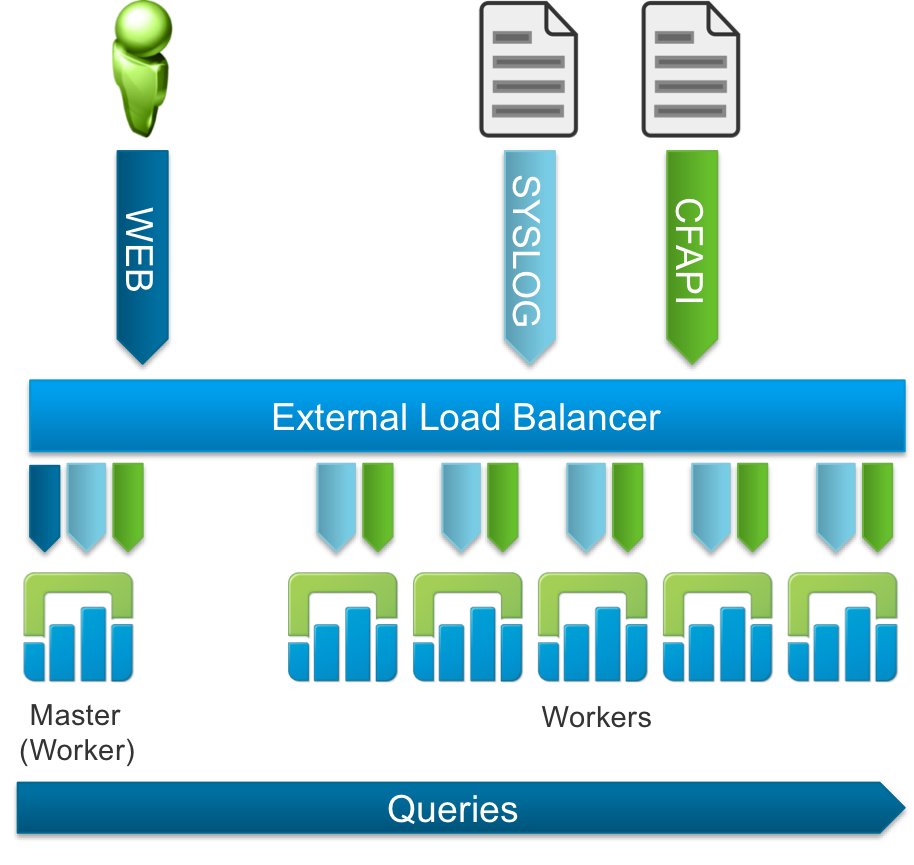 Log Insight 2.0 was the first release to support clustering. The architecture called for a 3-node cluster of medium or large VMs with an external load balancer configured in front of it. The best practice was to point all traffic to the external load balancer and the configuration required that ingestion traffic go to all nodes, but query traffic only go to the cluster master node. This configuration resulted in ingestion HA.