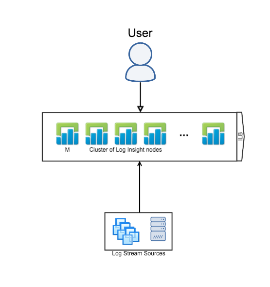 The next logical Log Insight reference architecture is where you have a single Log Insight cluster — with the Integrated Load Balancer (ILB) configured — and users/devices– including the Log Insight agent — connect directly to the ILB. This configuration is common for production environments in either a single datacenter. In general, this architecture is not recommended for production environments with multiple datacenters — see the next reference architecture instead.