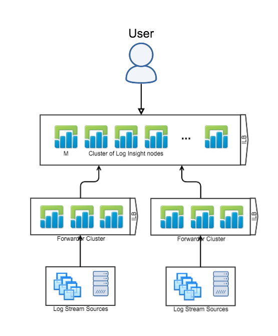 The next logical Log Insight reference architecture is where you have a single, central Log Insight cluster — with the Integrated Load Balancer (ILB) configured — and one or more Log Insight forwarder clusters — with the Integrated Load Balancer (ILB) configured. In this configuration, devices — including the Log Insight agent — connect directly to the local Log Insight forwarder ILB, each Log Insight forwarder is configured to forward events to the central Log Insight cluster, and users connect directly to the central Log Insight cluster ILB. This configuration is common for production environments with multiple datacenters. In general, this is the most common reference architecture, but some environments require even more availability — if more availability is desired, see the last reference architectures.