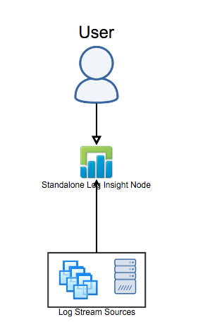The most basic Log Insight reference architecture is where you have a single Log Insight node and users/devices — including the Log Insight agent — connect directly to it. This configuration is common for proof of concepts, some test environments and some small environments where HA is not required. In general, this architecture is not recommended for production environments — see the next reference architecture instead.