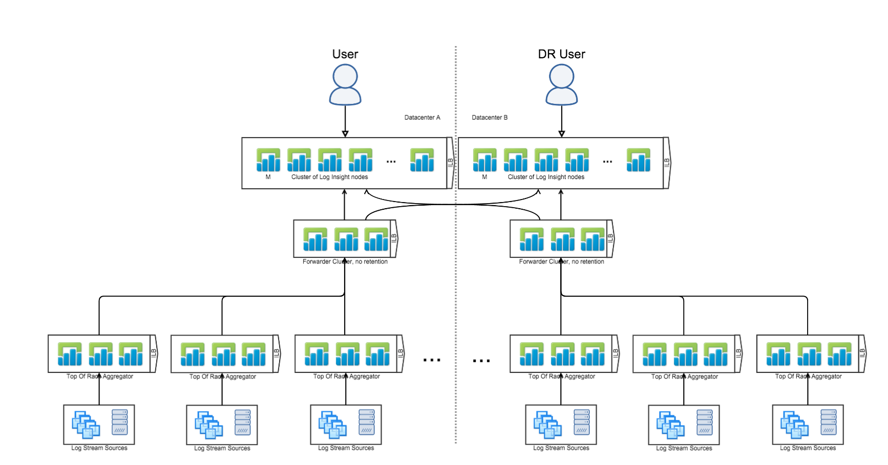 So the best practice is to have all clients log to a Log Insight forwarder and have the Log Insight forwarder forward to two different central Log Insight instances. This architecture prevents loops and provides for immediate failover capabilities in the case of DR.