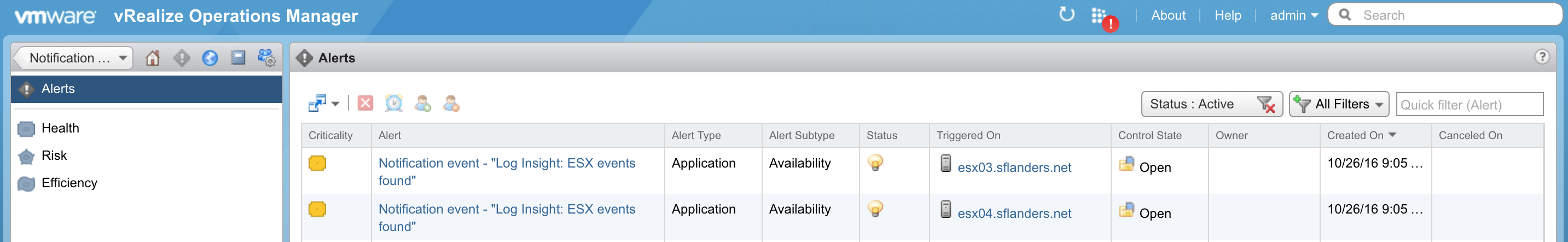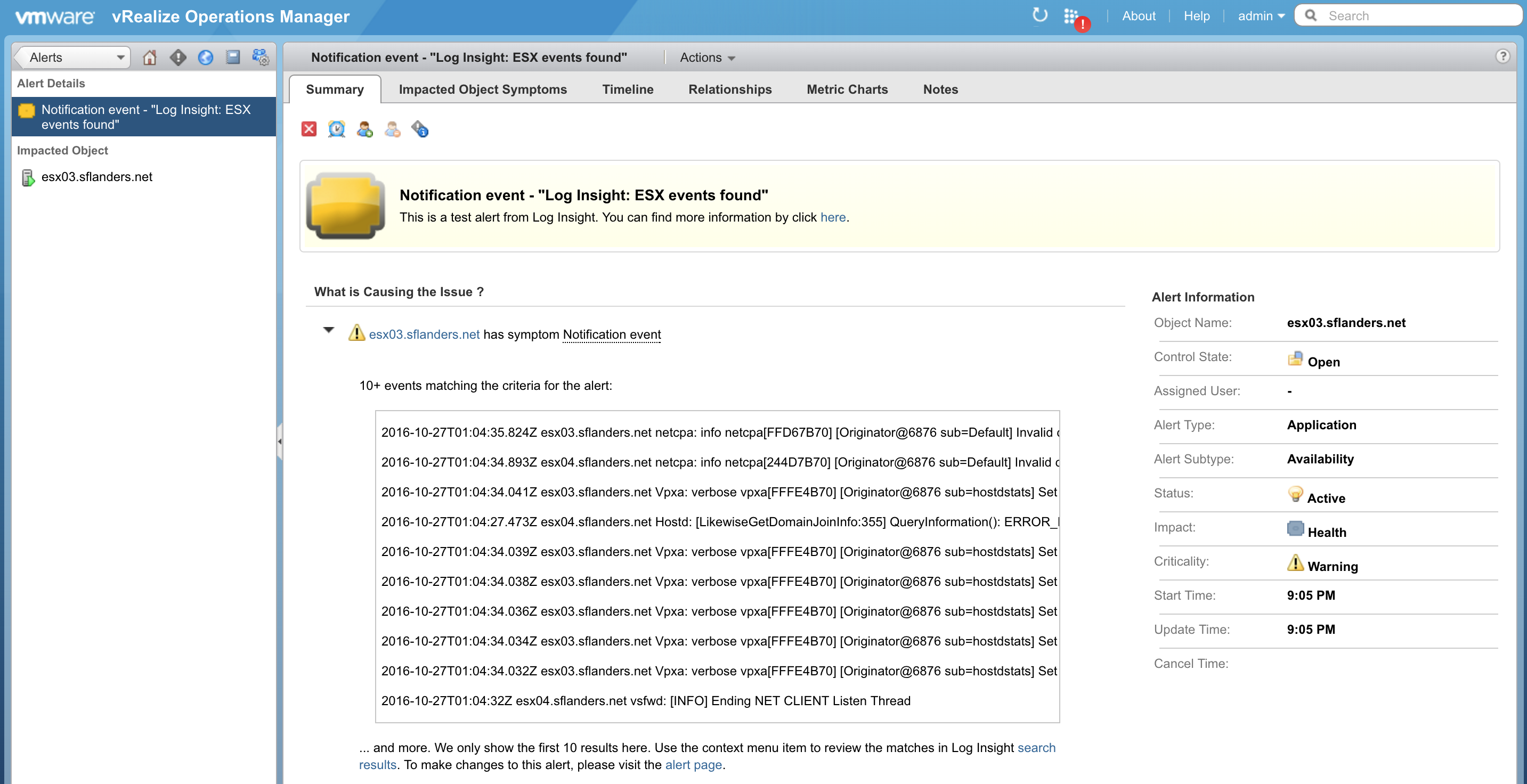 Note: Log Insight email alerts are generic while vROps alerts are object based. The alert results sent to vROps are generic and NOT object based. This means that object based alerting WILL work from Log Insight to vROps, BUT the results in the alert details may NOT be object specific. As a concrete example, take a look at the screenshot above. The alert is for esx03.sflanders.net, however if you look at the results, the last one is from esx04.sflanders.net. This means you will have an alert for both esx03.sflanders.net and esx04.sflanders.net in vROps — this is confirmed with the first screenshot above — and each may have results from the other.