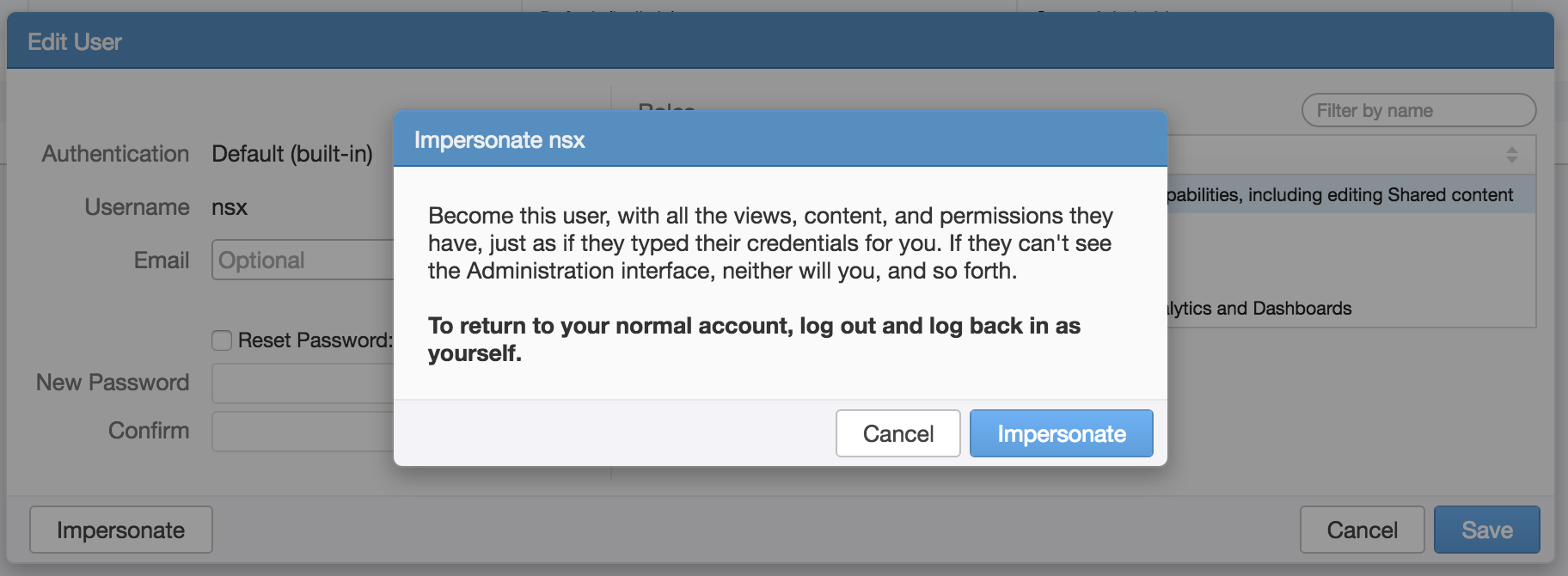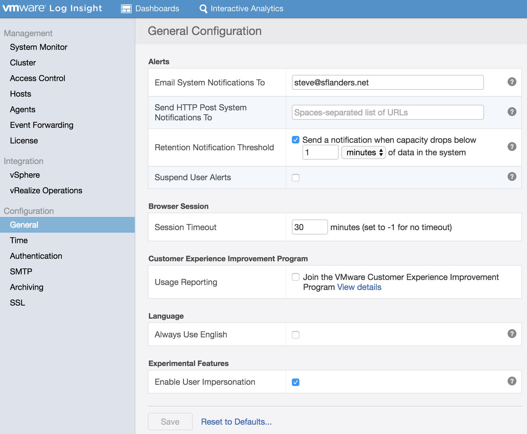 From here you can make changes as if you were that user. Now of course this could be considered a security issue. Log Insight handles this by logging all impersonation requests in ui_runtime.log. For example: