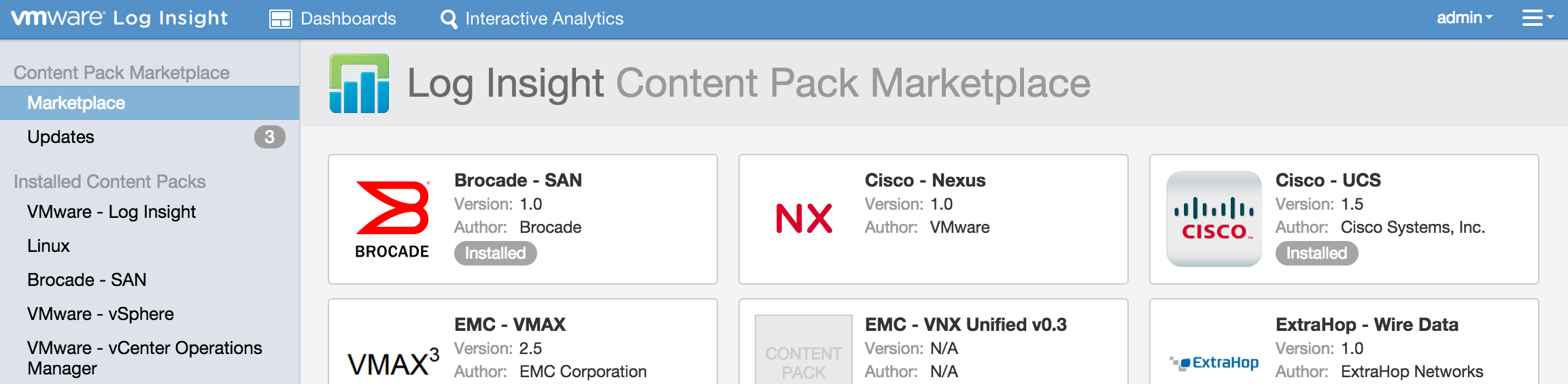 NOTE: All content packs are free. The Log Insight for vCenter edition only includes VMware product content packs.