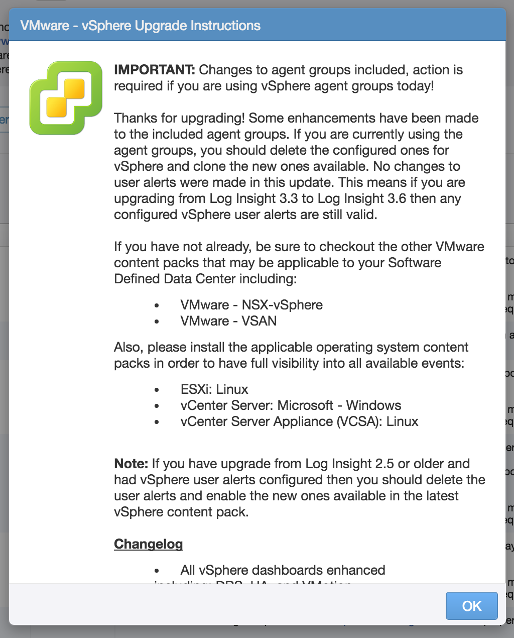 Protip: Upgrade instructions require Log Insight 3.6 or newer. Also, if you select the update all option then you will not be presented with upgrade instructions.