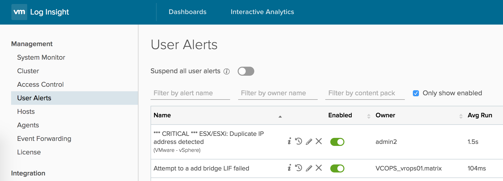 Log Insight has always featured the ability to create user alerts. User alerts can be triggered in a variety of ways including via email, vROps, and/or webhooks. One potential limitation of Log Insight user alerts is that they were fire and forget. What I mean is that there was no easy way to tell natively within Log Insight if/when a user alert had triggered. You could go to Manage Alerts on Interactive Analytics and individually run each alert over a desired time range, but this operation would take time and consume resources on Log Insight. What would be really nice is if user alert history could easily be displayed in Log Insight.