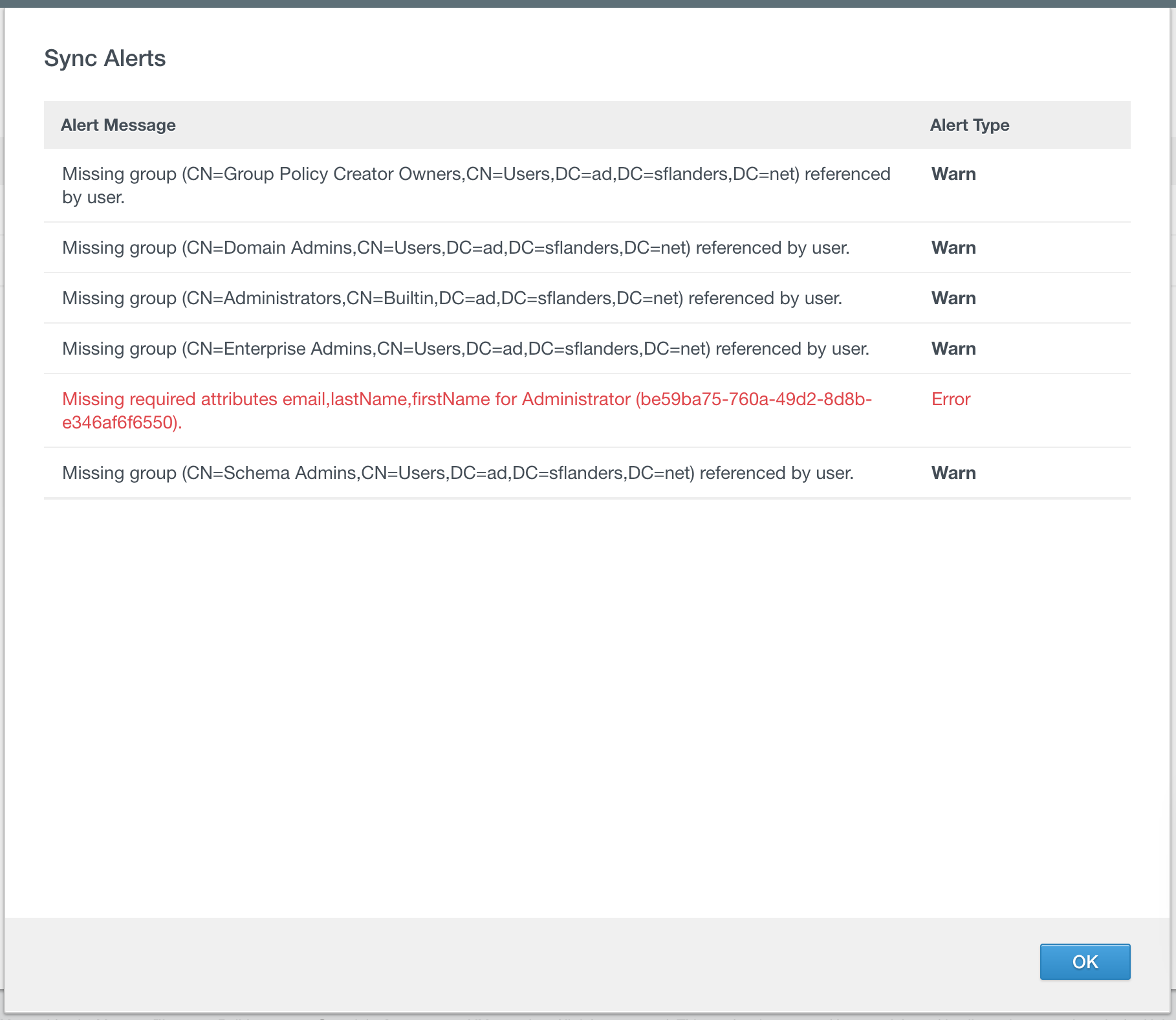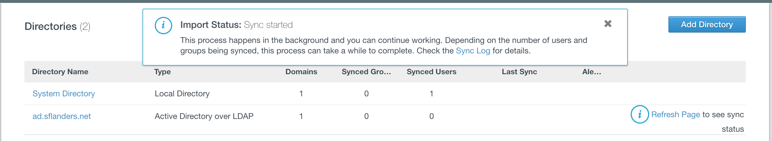 When the sync is done, you can see how many users were synced. If you see 0 this is a good indication something did not work. If you see any alerts (“Ale…”) then you should select the hyperlink to see what problems were reported.