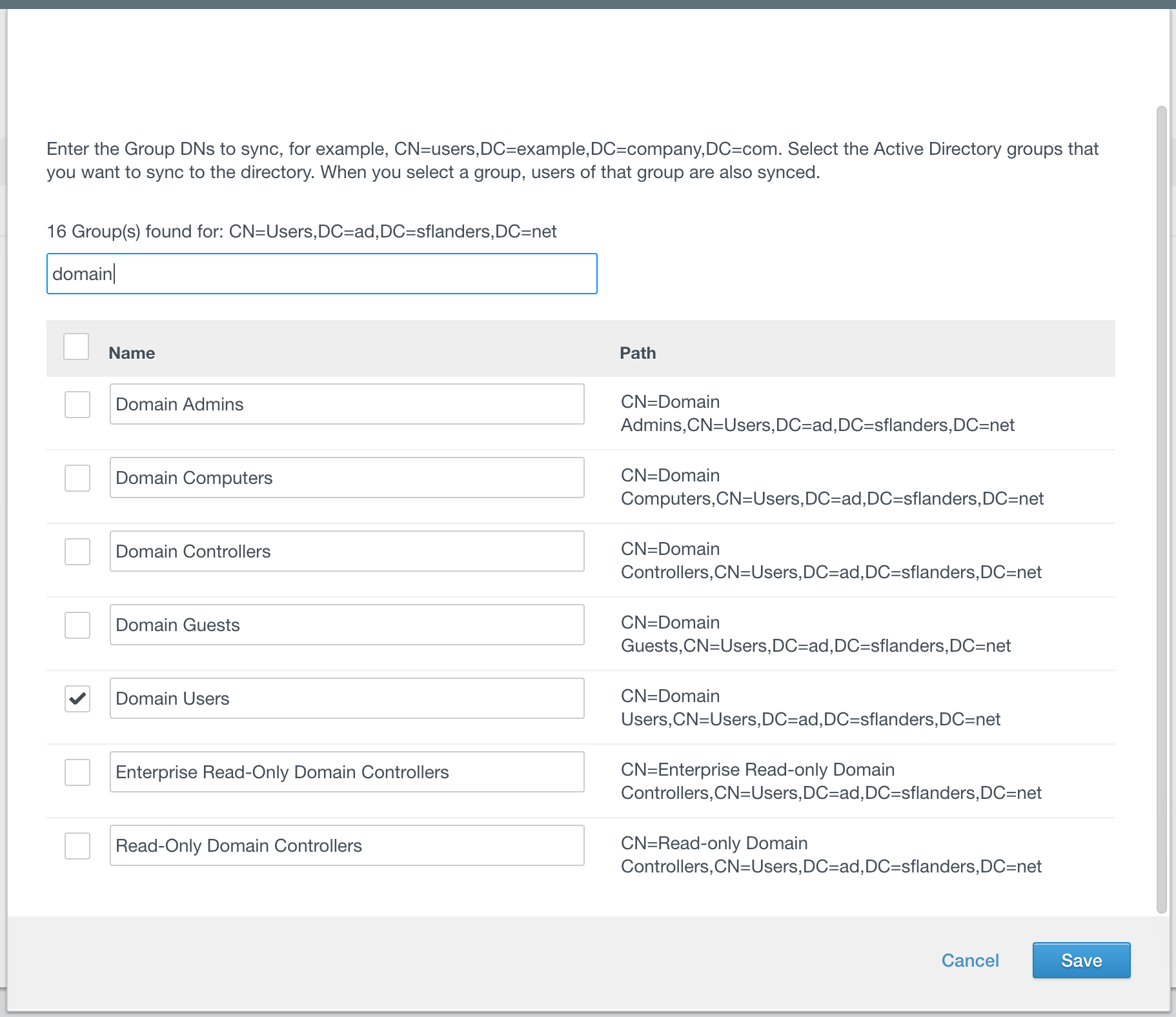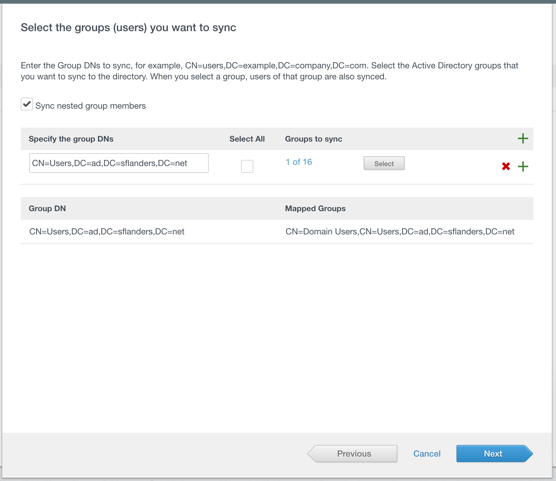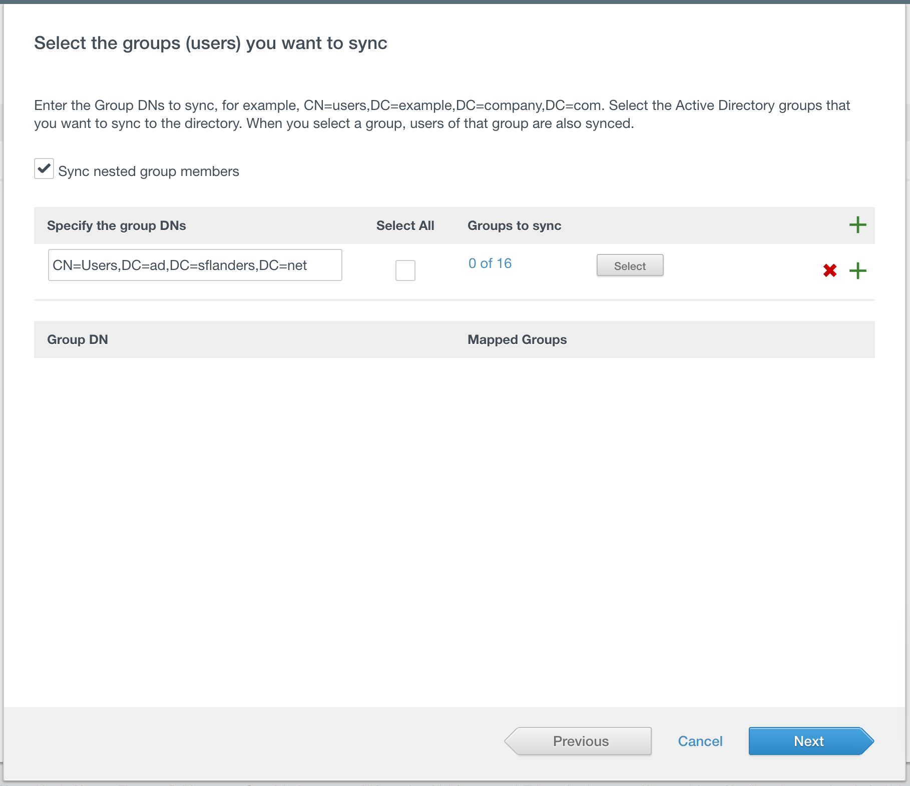 Then you need to specify which groups to sync. Once you specify the DN, you can select the group(s) you wish to sync by clicking the Select button.