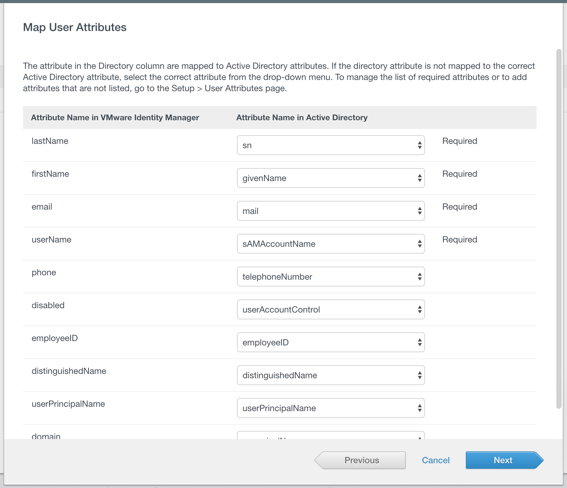 Then you need to map user attributes. In most case, you should be able to take the default settings. Note, in addition to the mappings you MUST ensure any user you wish to add has a minimum of the required attributes listed (lastName, firstName, email, and userName).