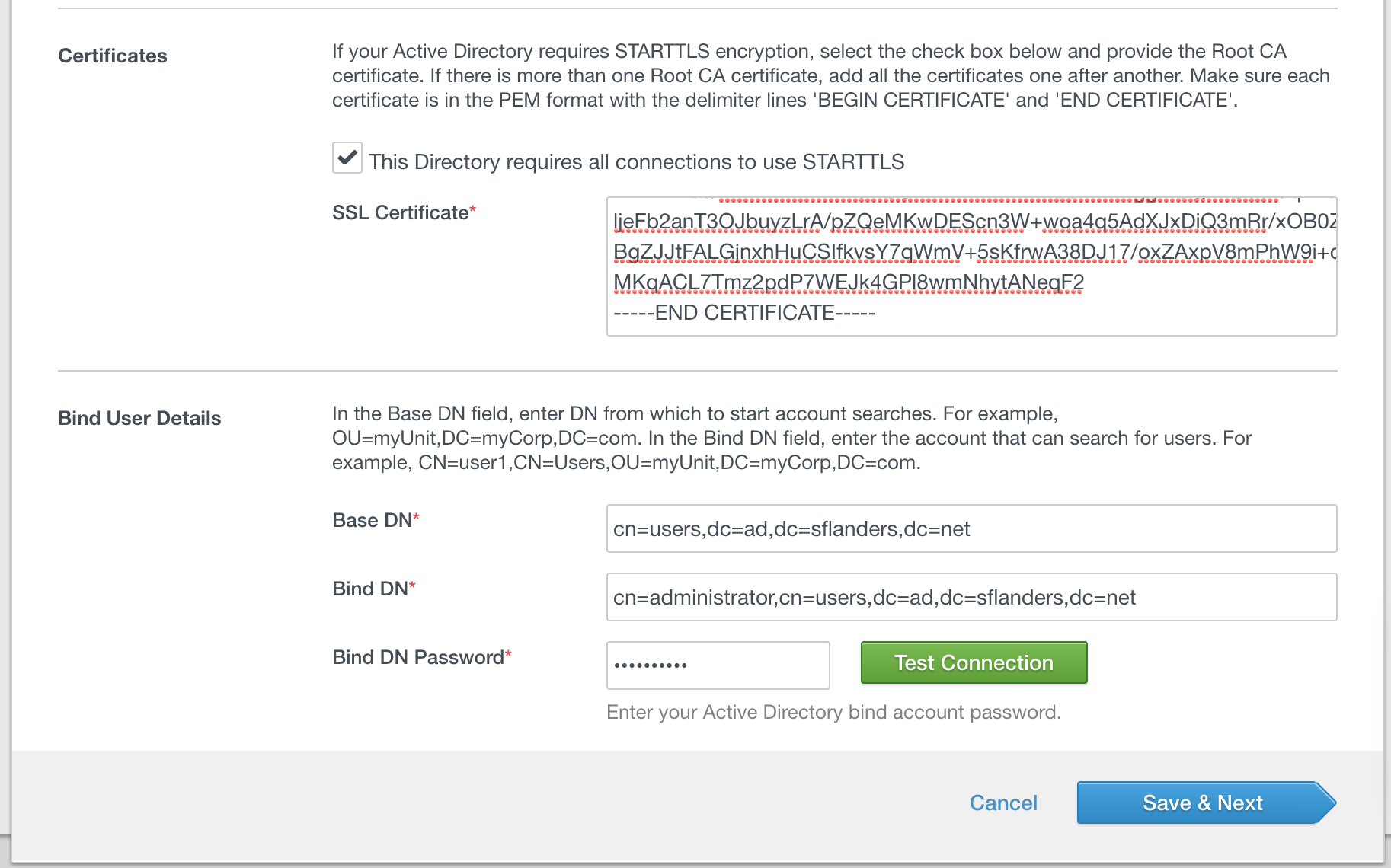 If you wish to connect to AD over TLS you must enter the SSL certificate. In general, the bind user details I used will work for most environments (changing the dc= to match your domain). Be sure to test the connection to ensure it is working properly.