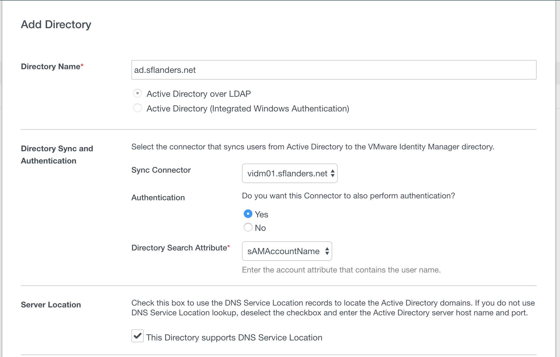 For Active Directory a variety of options are required. In general, you will want the Active Directory (Integrated Windows Authentication) radio button. The directory name is just used to identity the directory you are adding — I use the same name as the domain I am joining. The sync connector would be the VIDM instance you want to connect to. The directory search attribute only needs to be changed if you know something other than the sAMAccountName is used in your environment.