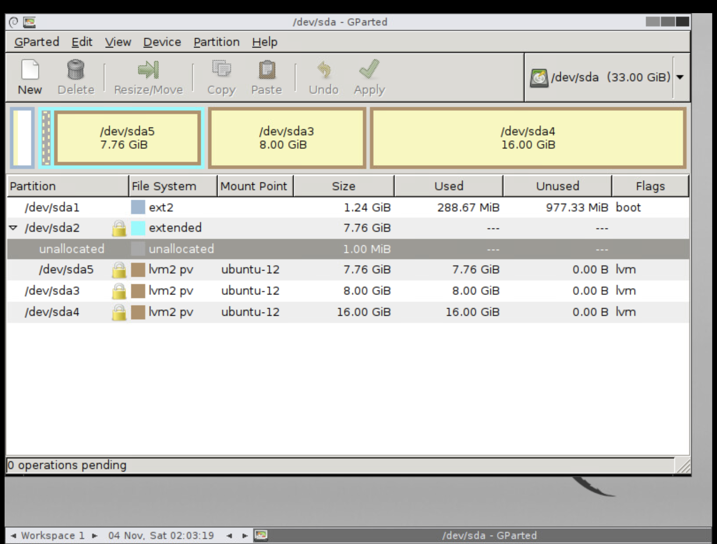 The next partition (/dev/sda2) is interesting because it is an extended partition. This mean you need to grow the extended partition first, move the containing partition to the right from bottom to top, and then shrink the extended partition back to its original size. It is worth noting that I hit an interesting issue when attempting to perform these operations — I received an error from libparted messages: cannot have overlapping partitions. The solution was to change the alignment drop-down option under the Resize/Move option from the default of Mb to none. Again, you will need to select the Ignore option for every pop-up. Now you can finally expand the boot partition (/dev/sda1). You will notice when I was done I ended up with a 1 MiB unallocated within the extended partition — this is likely because of a pre-existing alignment issue with the drive layout.