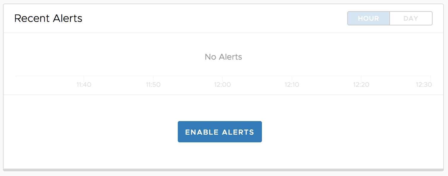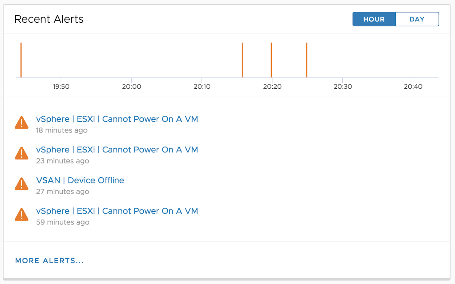 The recent alerts card shows you alerts that are configured that have recently triggered. In addition to seeing the latest five alerts, you can see a timeline of when the alerts fired over the last hour with the option to change this timeline to the last day. For the latest five alerts you have the option of clicking the title to learn more about that particular alert. You can also select the More Alerts button at the bottom of the card to see more alerts that have triggered.