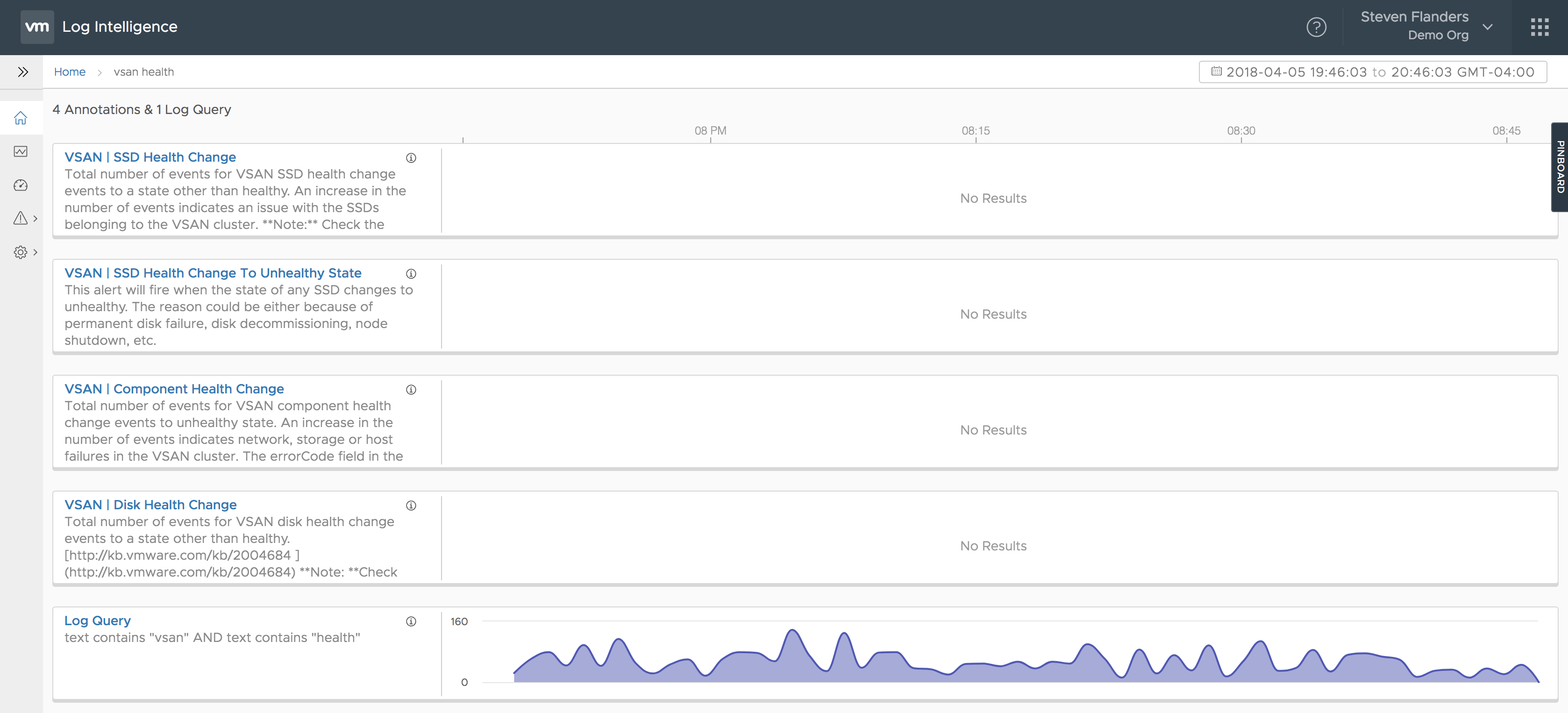 you would expect it to search for events ingested that contains the keywords “vsan” and “health”, but in addition Log Intelligence will query over relevant built-in content like that found in the VSAN queries: