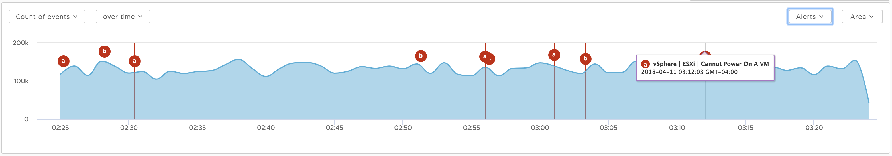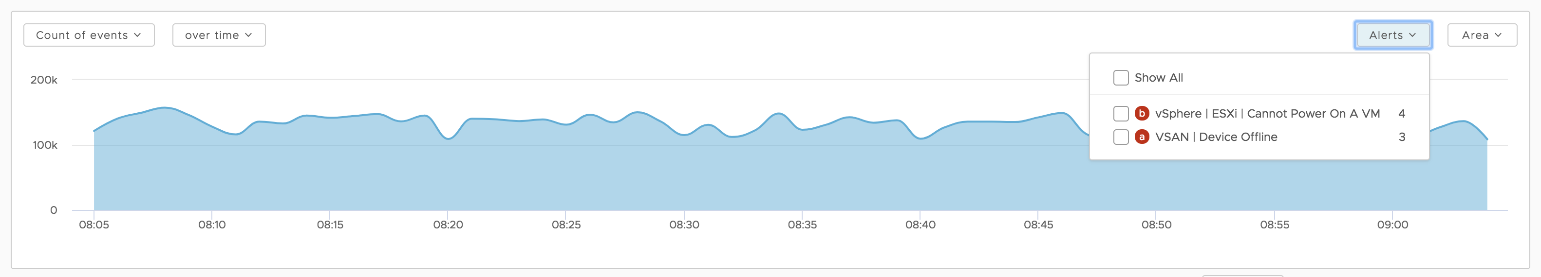 The next section of the Explore page is the chart. The chart can be manipulated to leverage mathematical functions, groupings, and with or without time. In addition, the chart type can be changed depending on the query constructed. (Note: All of this is the same as Log Insight). One cool feature is the ability to overlay alerts — from the Recent Alerts page — on top of the chart. This can be extremely helpful when troubleshooting issues. (Note: This is different from Log Insight)