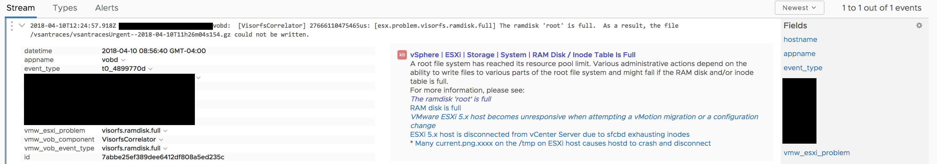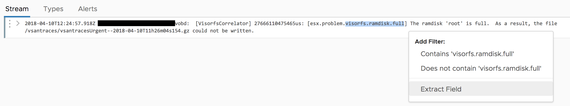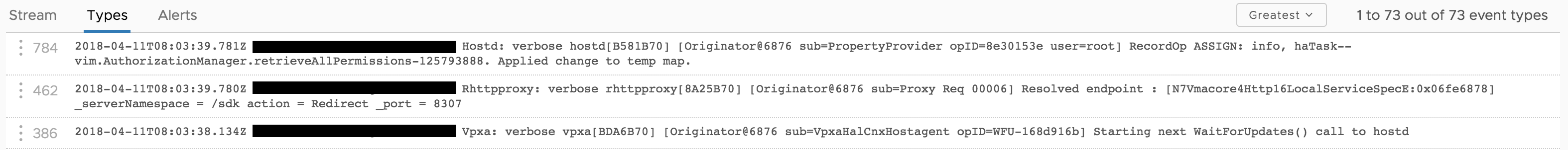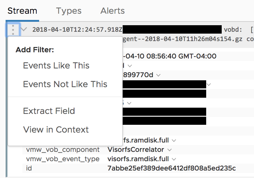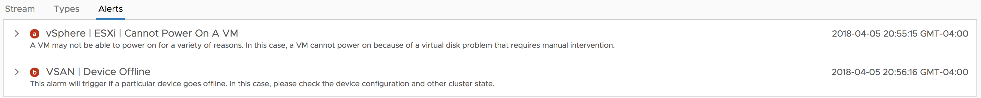 You will notice that in addition to the Stream tab, you have Types and Alerts. Types are summarizations of ingested events (Note: Same as Log Insight but without schema discovery today):