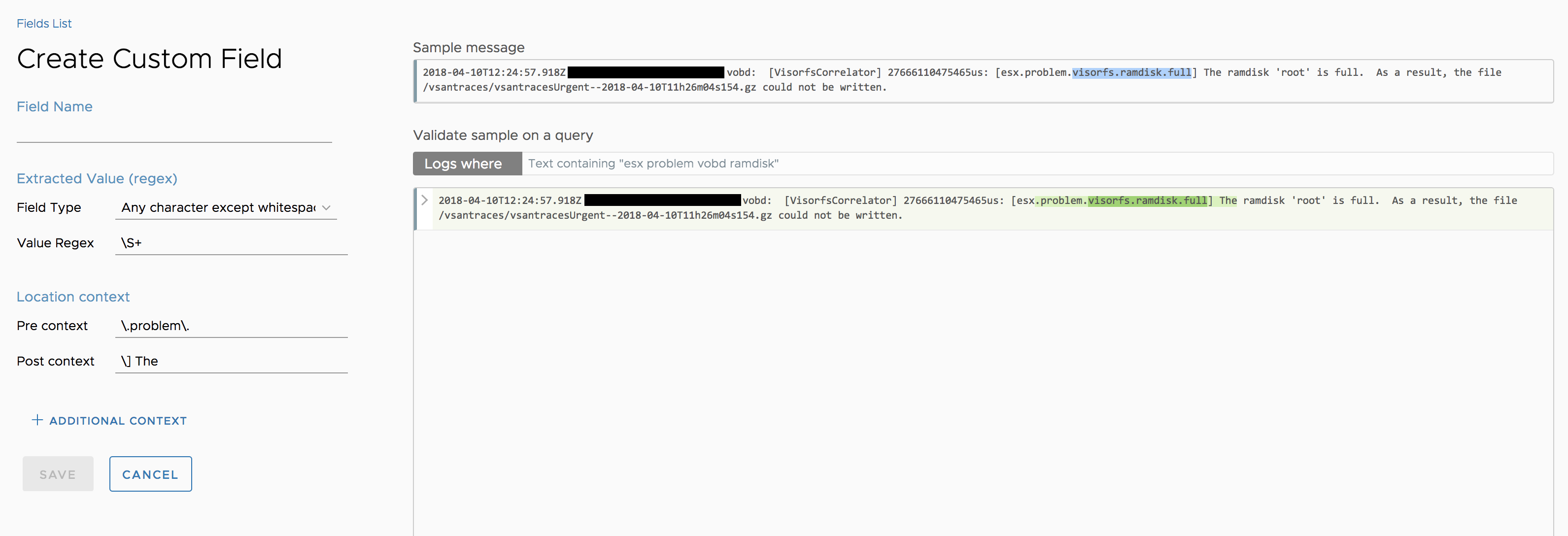 Doing this brings you to the Create Customer Field wizard, where Log Intelligence attempts to create the field definition for you. At a minimum, you must enter a unique name for the field.