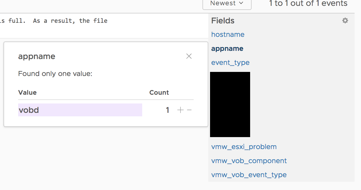 The events are shown in a “tail”-like fashion but have the ability to be expanded to show fields discovered. In addition, if an event has been annotated, then the annotation is shown on expansion. When collapsed, annotated events have a blue bar on the left edge of the event. (Note: Hidden fields by default and event annotations are different from Log Insight)