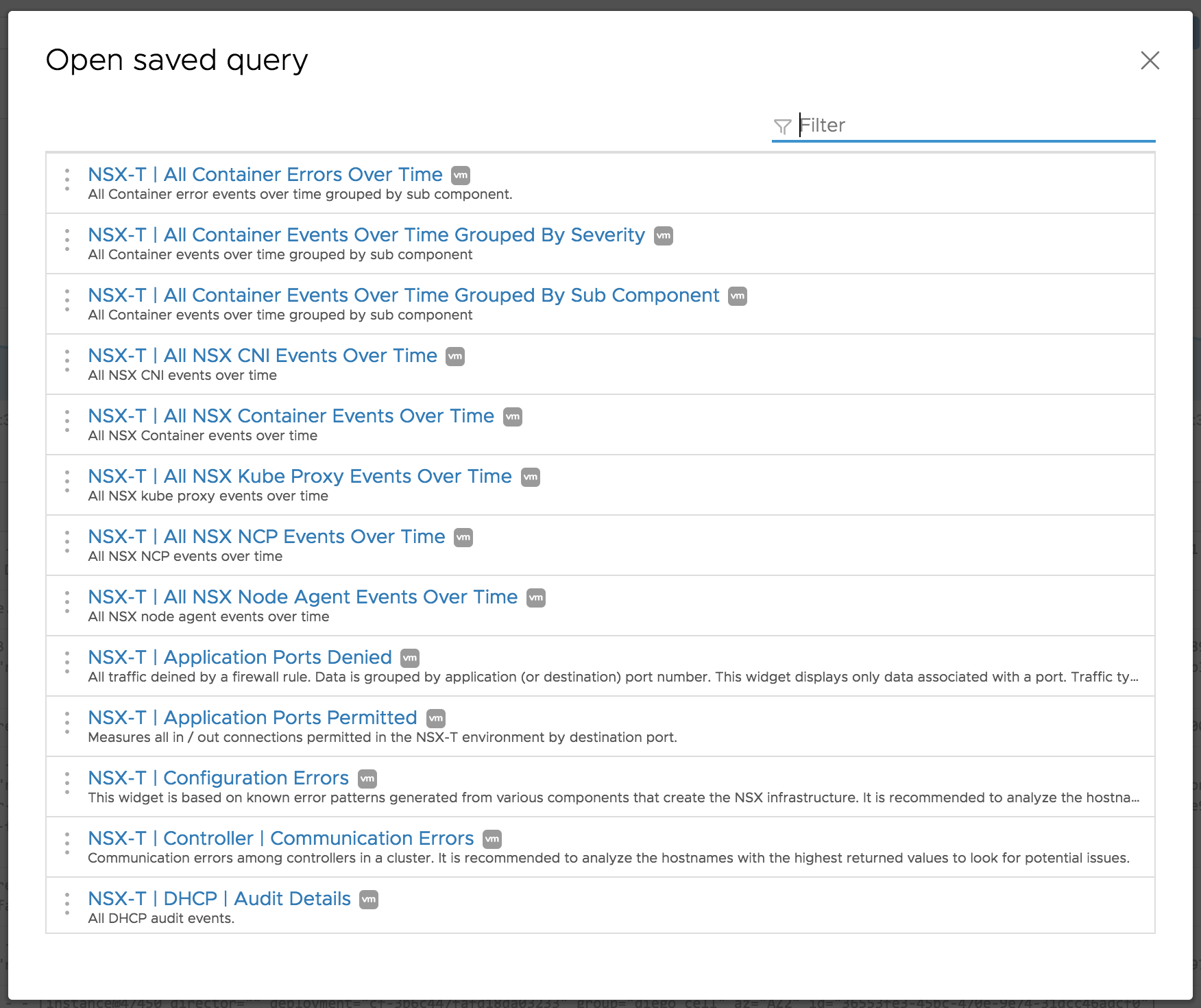 As you can see, this dialog shows all of the saved queries in the system, including content and tenant-specific. You have the option to filter to the results shown as well as open any result.