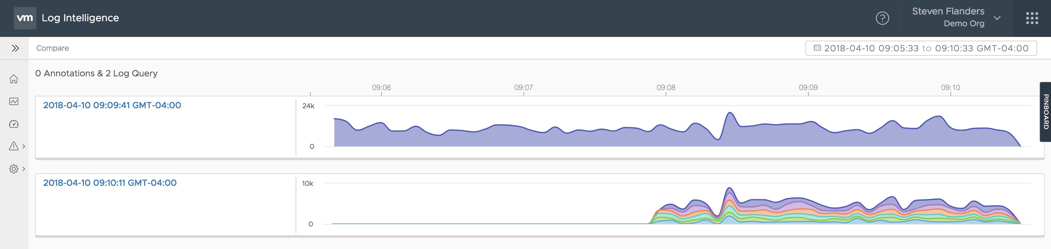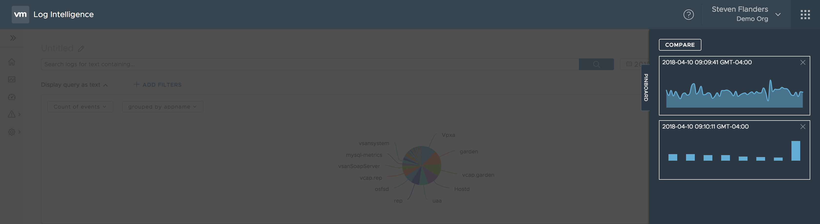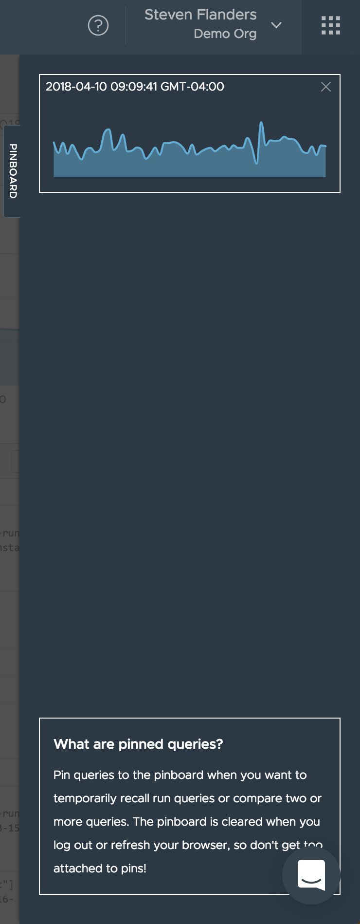 You may notice the right-hand tab on the page called pinboard. You can select the tab to pull it out, or for a given query, you can select the pin button near the top, right-hand side of the page. The pinboard and associated pins are similar to the snapshot functionality in Log Insight. Pins are temporarily stored queries for a given user. For a given query on the Explore page, you can select the pin icon to add it to the pinboard.