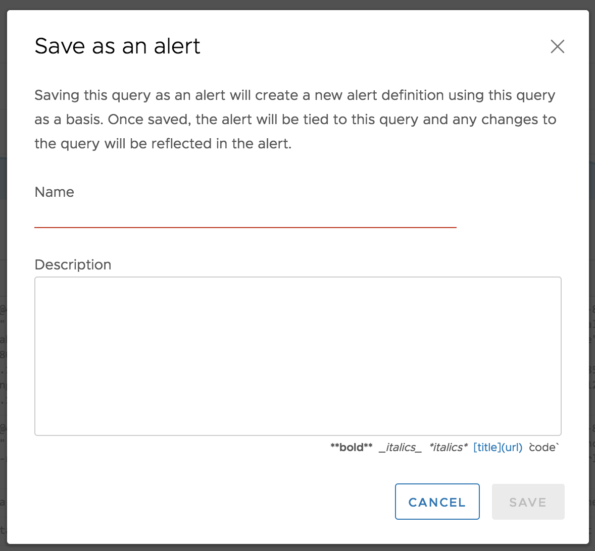 Similar to saving a query, to save an alert, you must provide a unique name.