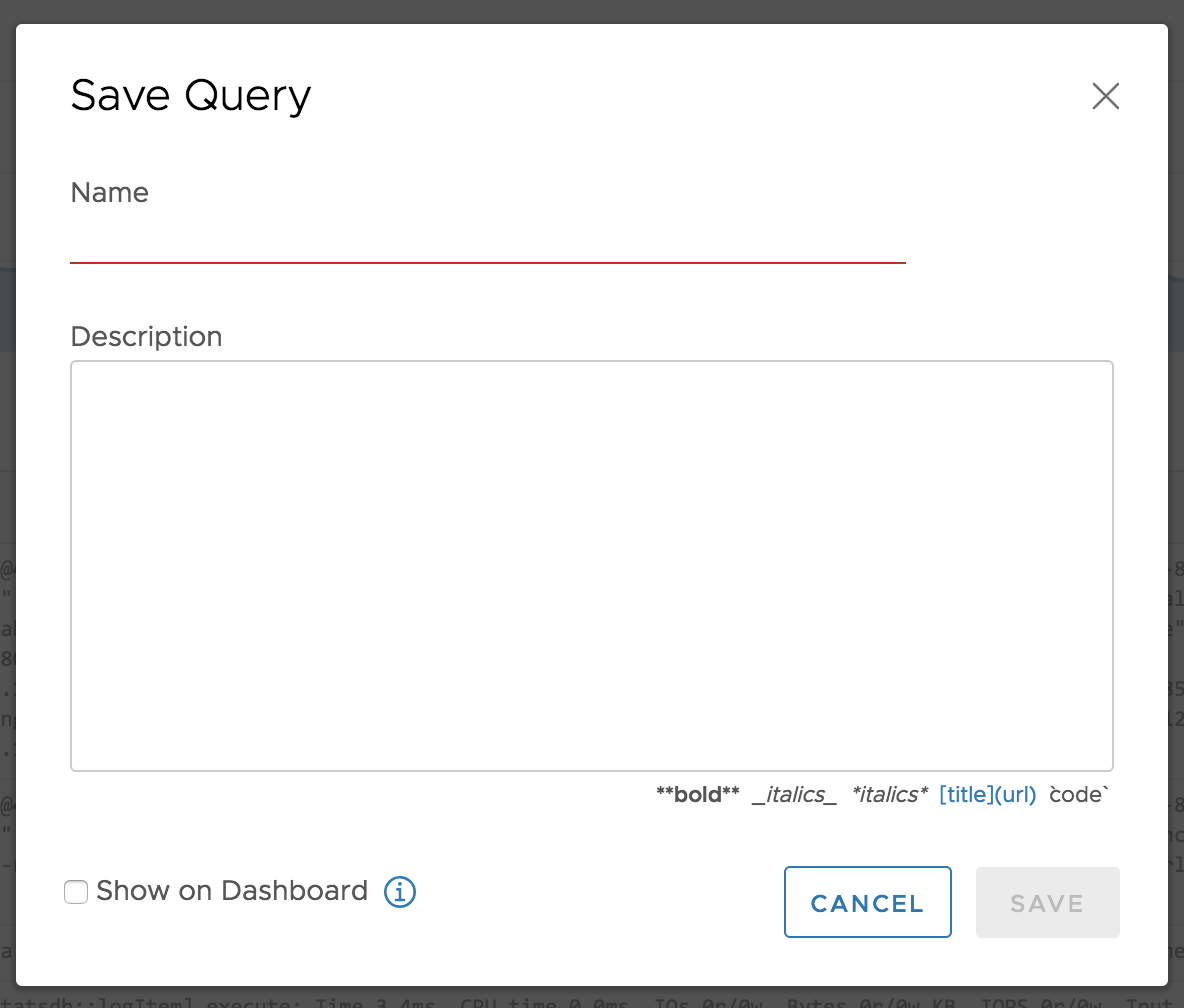 - Open a saved query (from the Open option in #2 above) and then follow step #2 to Add to Dashboard — this will update the saved query without opening the save dialog