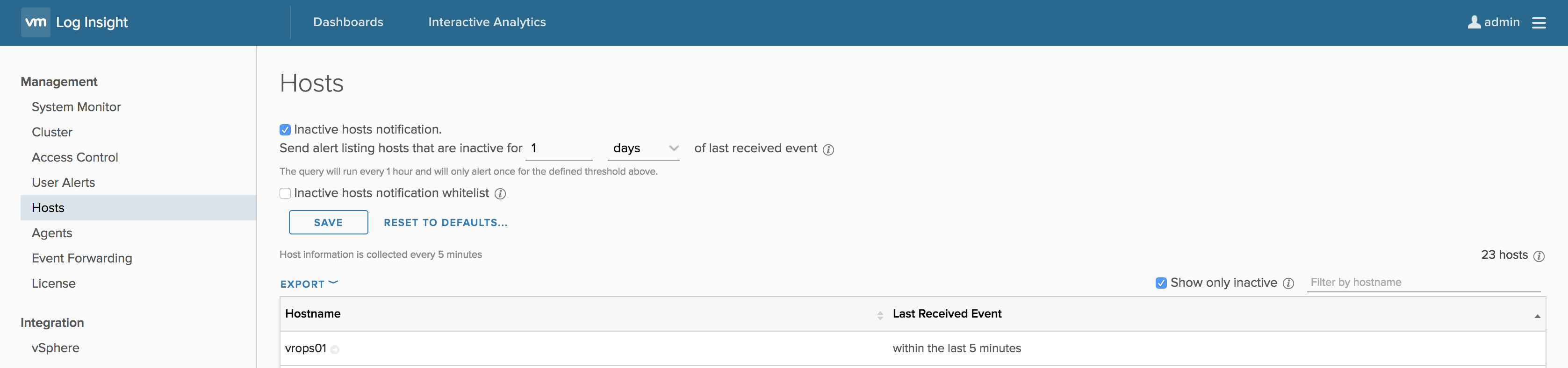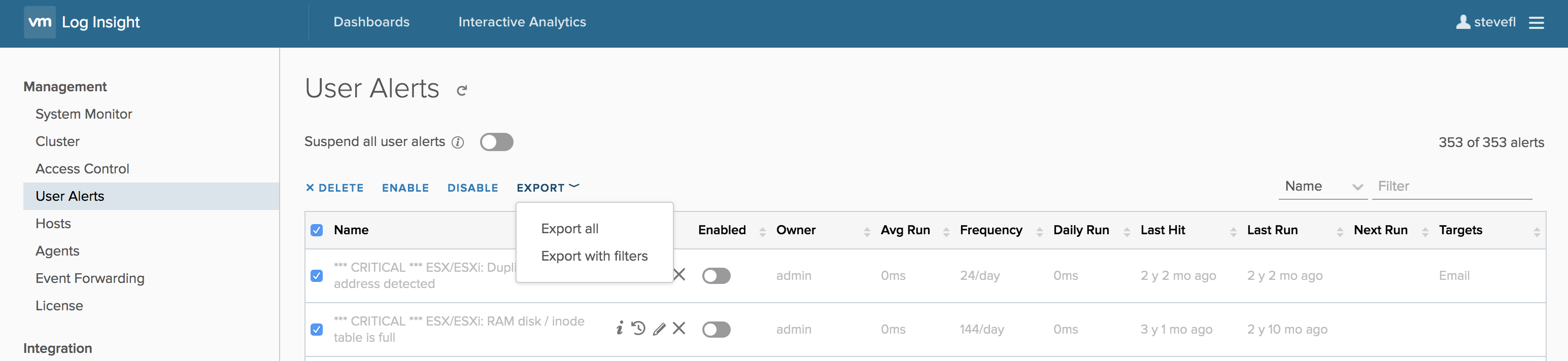 I already covered the inactive host’s notification and I mentioned in Log Insight 4.5 that you could filter by hostname. Like the User Alerts page, you can now export the hosts as well — something that was asked for a ton!