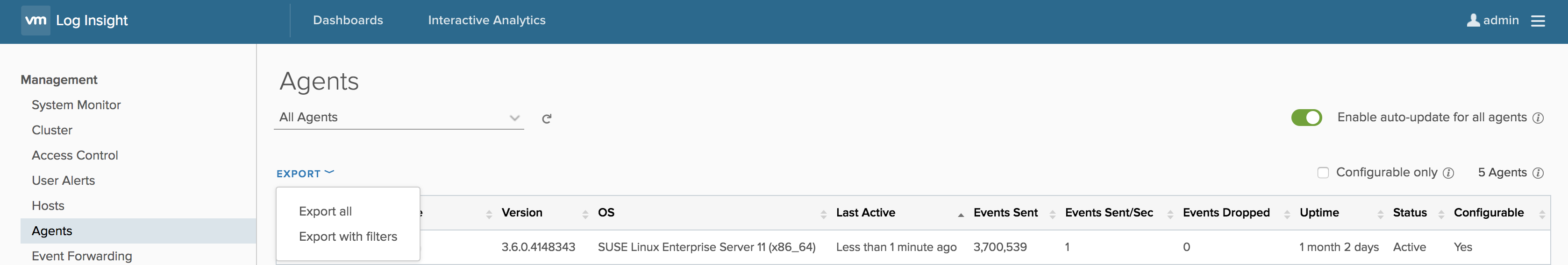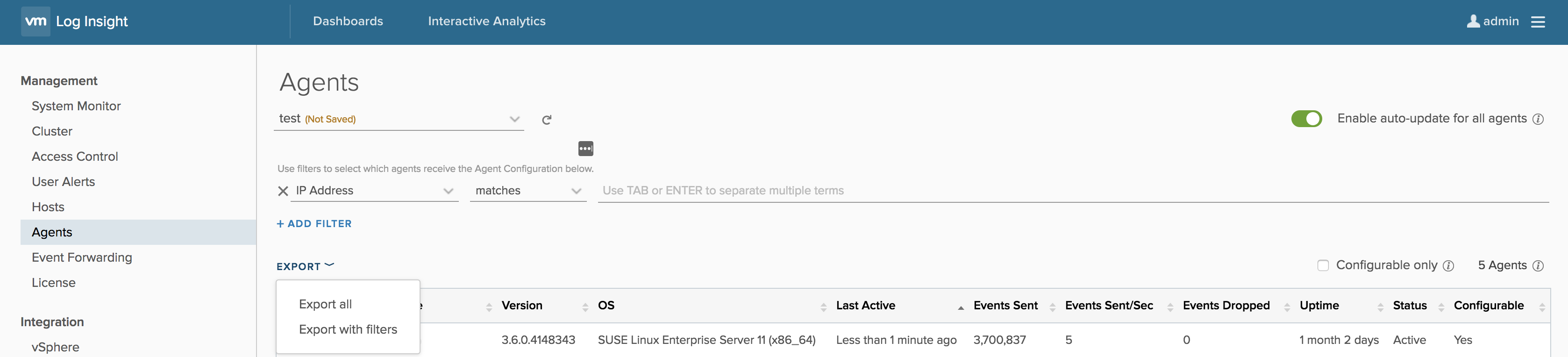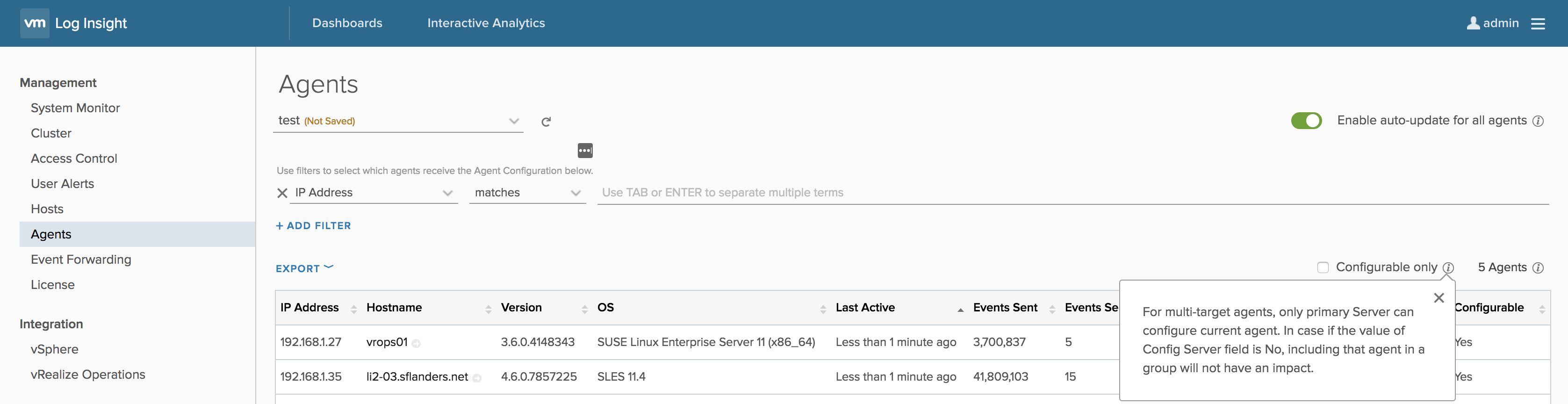 Finally, you will notice that you can show only the agents which can be configured from this Log Insight instance. Remember, with multiple destination support, it is possible to have the same agent reporting to multiple different Log Insight instances. Still, configuration can only be done by “server” (i.e., the first one):