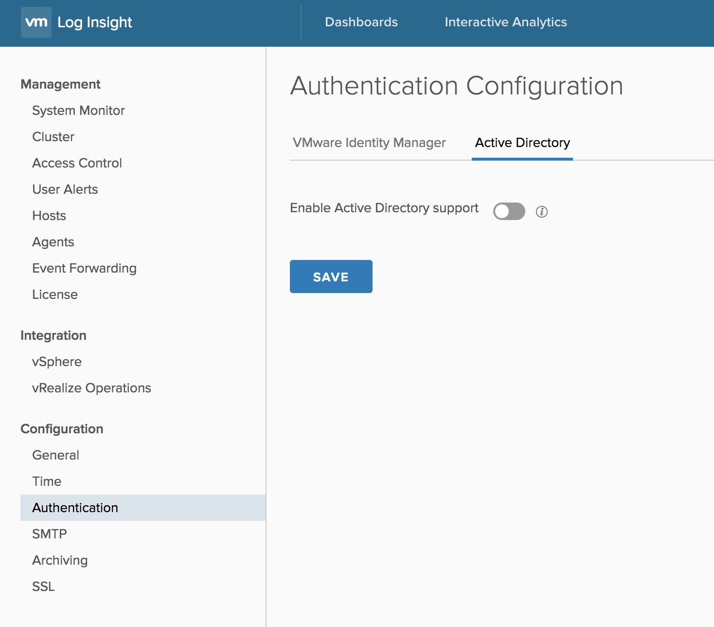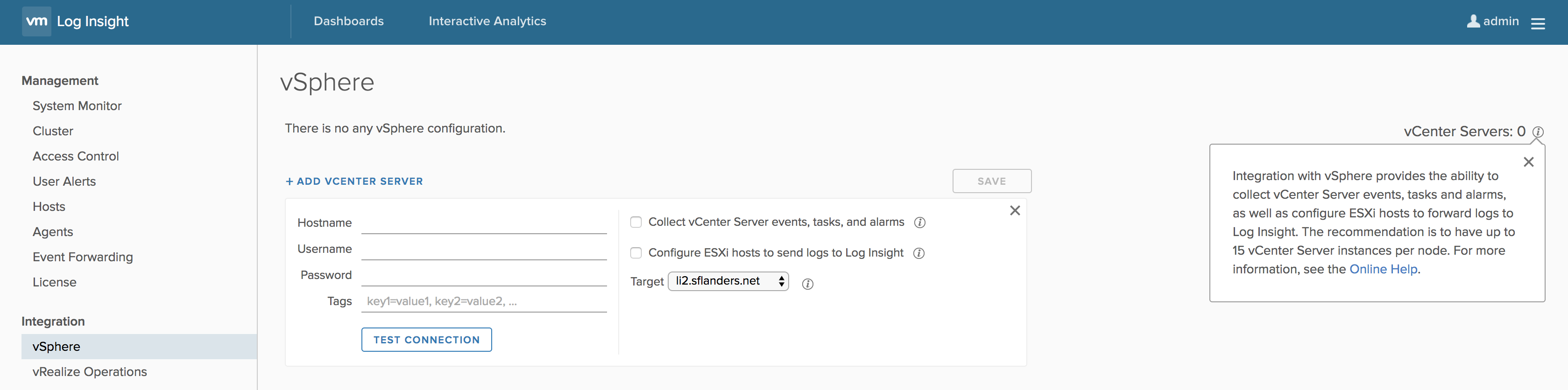 The add and save buttons for vSphere integration have been moved to the top. In addition, Log Insight now supports 15 vCenter integrations PER NODE. This means if you have a 12 node cluster, then that cluster supports up to 180 vCenter integrations (the previous maximum was 10 per cluster)!